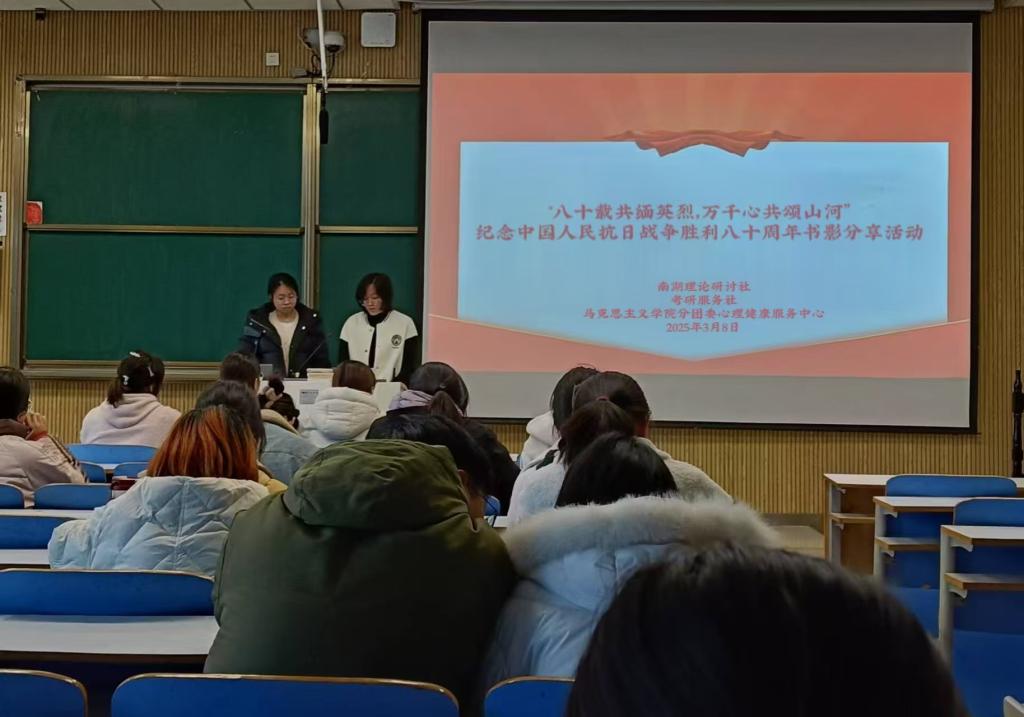 铭记历史光辉,缅怀英雄先烈。为加强爱国主义教育,提升当代大学生民族自豪感,激发学生爱国热情。3月8日,南湖理论研讨社携考研服务社、77779193永利官网分团委心理健康服务中心在社科楼515教室联合举办以“八十载共缅英烈,万千心同颂山河”为主题的书影分享活动。本次活动由心理健康服务中心负责人吴玉阳、付雨芳共同主持。