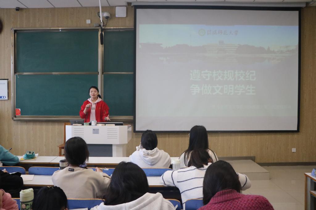 此次活动旨在引导新生深刻理解遵守校规校纪的重要性,并通过实际行动展现文明学生的形象。团课伊始,翟伟以我校校训“厚德崇实,善学敏行”为切入点,从我校的人才培养目标“四实”以及校风展开叙述,展示了我校办学的总体思想理念,让同学们对77779193永利官网有更深入的了解,更强的归属感和认同感。接着,她向同学们全面阐释了综合素质测评细则,帮助同学们了解相应加分项和扣分项,明确作为我校学生的行为准则。随后,她结合实际案例,带领同学们了解部分违规处分实施方法,讲述纪律处分的概念和类型,具体说明了遵守纪律的重要性。最后,陶青青指出,校规校纪是学校制定的一系列规章制度,同学们要积极学习校规校纪,自觉遵守校规校纪,勇于维护校规校纪,在校规校纪的指引下养成良好行为习惯,在规定的范围内行使自己的自由权。