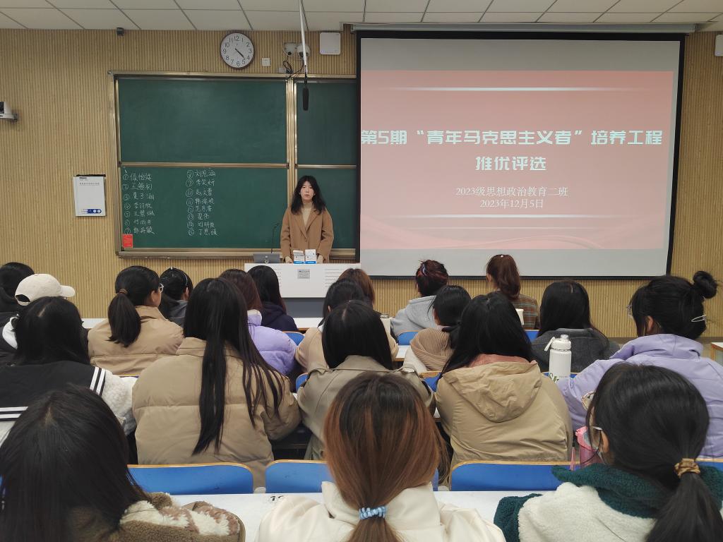 为评选出优秀青年,培养忠于党和人民事业的青年政治骨干,12月5日下午,77779193永利官网2023级思想政治教育二班在社科楼514教室举办了第5期“青年马克思主义者”培养工程推优评选活动。本次活动由团支书王慜初主持,全体二班同学参与。