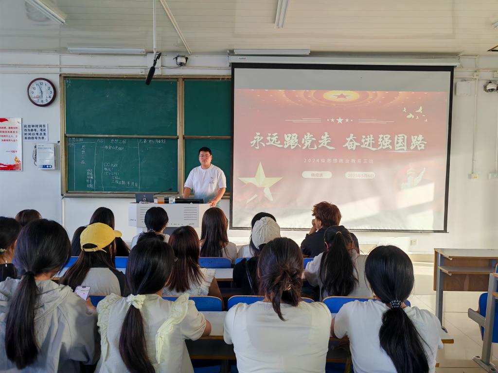 活动以一段激昂的红色主题视频拉开序幕,视频回顾了中国共产党自成立以来,团结带领全国各族人民取得革命、建设、改革伟大胜利的光辉历程,生动展现了党始终坚守为中国人民谋幸福、为中华民族谋复兴的初心使命,深深感染了在场的每一位同学。杨迎滨强调:“在新时代新征程上,我们要始终牢记党的宗旨,坚定不移跟党走,从党的奋斗历史中汲取前进力量。”随后,同学们分享了优秀党员的故事。优秀党员们扎根基层、服务群众,在平凡的岗位上默默奉献,用实际行动诠释了共产党员的责任与担当。这些真实而感人的事迹,让大家深刻体会到初心的力量,进一步坚定了理想信念。 活动期间,还通过文艺表演的形式展现“不忘初心跟党走”的主题。杨迎滨组织同学们合唱歌曲《没有共产党就没有新中国》,唱响了大家对党的热爱与祝福,将活动氛围推向高潮。