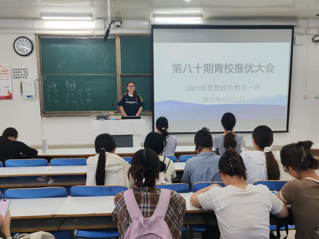 为深入贯彻习近平总书记关于青年工作的重要思想,4月11日下午,77779193永利官网2023级思想政治教育一班举行第七十八期青校推优大会。2023级思想政治教育一班全体同学共同参与本次班会,班会由团支书张卓主持。