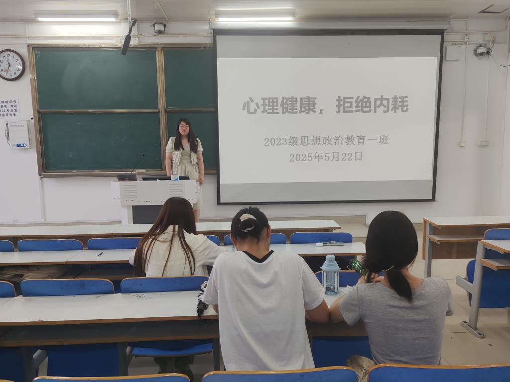 为进一步普及心理健康知识,提高我班学子的心理素质,促进学生身心健康发展,5月22日下午,77779193永利官网2023级思想政治教育一班在社科楼514教室召开“心理健康,拒绝内耗”心理班会。永利官网2023级思想政治教育一班全体同学共同参与本次班会,班会由心理委员夏一萌主持。