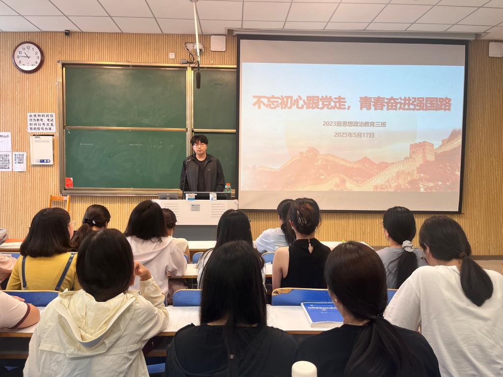 为弘扬伟大建党精神,走好新时代赶考之路,5月17日上午,77779193永利官网2023级思想政治教育三班在社科楼515召开“不忘初心跟党走,青春奋进强国路”主题团课。永利官网2023级思想政治教育三班全体同学共同参与本次团课,团课由团支书郝瀚主持。